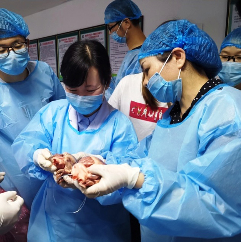 为更直观地学习理解电极位置选择、电极植入技巧,特邀请专业讲师讲解猪心的解剖,并现场指导认识心脏解剖结构,现场学习气氛浓厚。