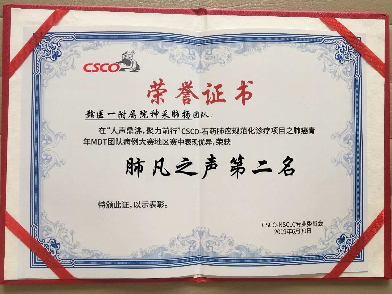 6月30日,中国临床肿瘤学会(CSCO)肺癌规范化诊疗项目之青年MDT病例大赛江西赛区大赛在南昌举行,一附院肺癌多学科诊疗(Multi-Disciplinary Treatment,MDT)团队表现优异,再创佳绩,喜获全省第二名的好成绩。