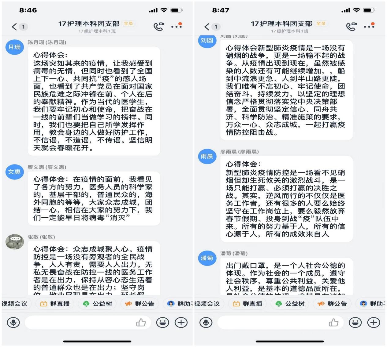 在护理学院2017级护理专业本科1班团支部线上主题团日活动中,同学们针对“作为医学生,我能为防疫工作做什么?”这一话题展开热烈讨论,同学们纷纷表示,突如其来的疫情让我们看见了病毒的无情,也看见了全国人民万众一心、医护人员舍身逆行的人间大爱,在这次防疫工作中,我校附属医院不仅承担着属地防疫的重点工作,更是派出医疗队驰援武汉,我们的校友和身边同学也涌现出一大批优秀的感人事迹,作为当代医学生,我们要牢记“敬佑生命、救死扶伤、甘于奉献、大爱无疆”的初心使命,为打赢这场防疫攻坚战贡献自己的一份力量。