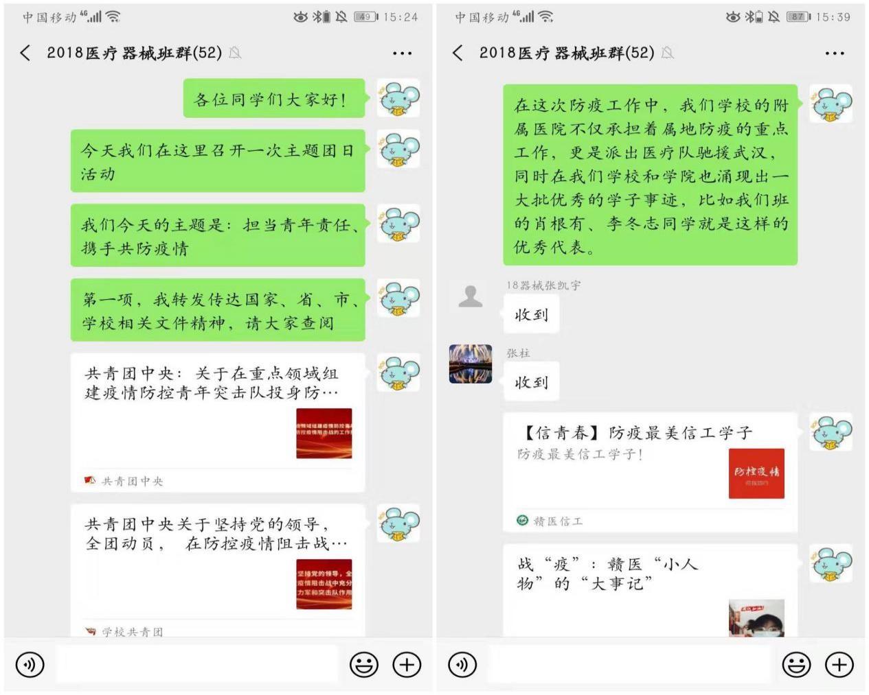 在信息工程学院2018级医疗器械维护与管理团支部线上主题团日活动中,班主任老师以“担当青年责任、携手共防疫情”为主题,向同学们传达了团中央、教育部、省、市、校关于防疫工作的相关要求,号召全班同学向班上肖根有、李冬志两位参与属地防疫工作的同学学习,立足专业,在加强自我防护的同时争取更大社会作为。