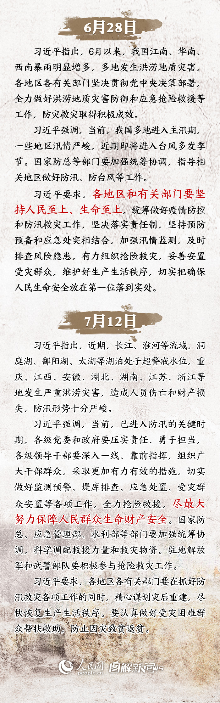 面对严峻的防汛形势,习近平总书记高度重视,于6月28日和7月12日先后两次对防汛救灾工作作出重要指示。“人民至上、生命至上”,习近平要求各部门坚持把确保人民群众生命财产安全放在首位,落实责任,狠抓隐患排查,强化应急预案,进一步加强监测预警、联防联动,为当前防汛抢险救灾工作指明了方向。