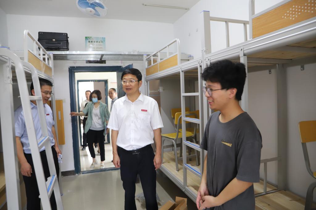 张小康一行来到学生宿舍1栋-6栋,听取宿舍改造有关情况汇报,详细了解宿舍改造进展情况,仔细查看各楼栋和寝室新改造安装的设施设备,以及宿舍消防、安防、值班室建设等,并与已到学校的学生亲切交谈。