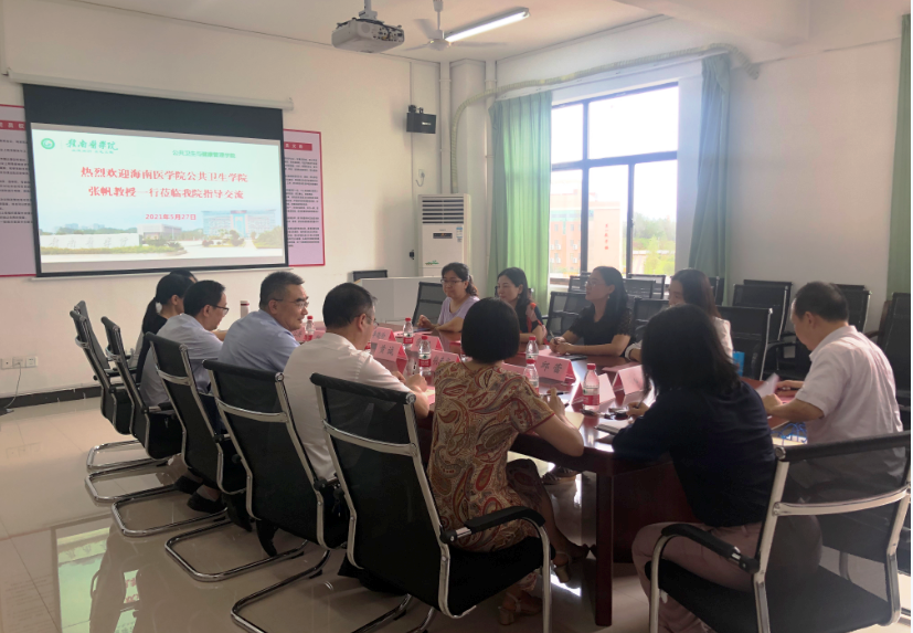 5月27日,海南医学院公共卫生学院院长张帆一行到公共卫生与健康管理学院考察交流。该院院长黄诚主持,预防医学专业负责人、各教研室主任及第十届中国大学生医学技术技能大赛指导老师参与交流。