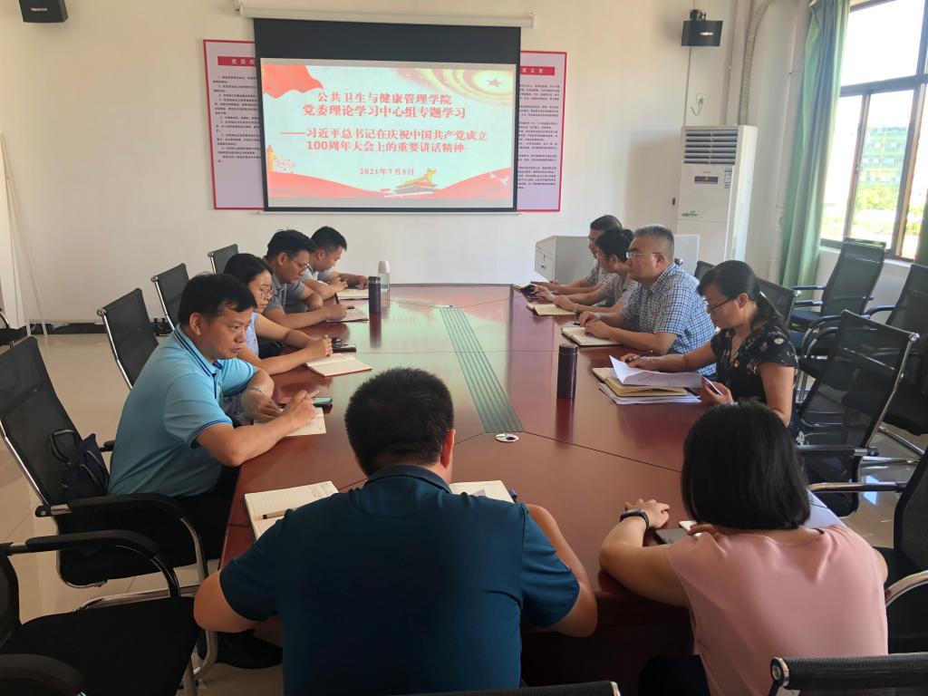7月5日,公共卫生与健康管理学院召开了党委理论学习中心组专题学习会议,学习了习近平总书记在庆祝中国共产党成立100周年大会上的重要讲话精神,学院领导、各党支部书记、教研室主任参加会议。