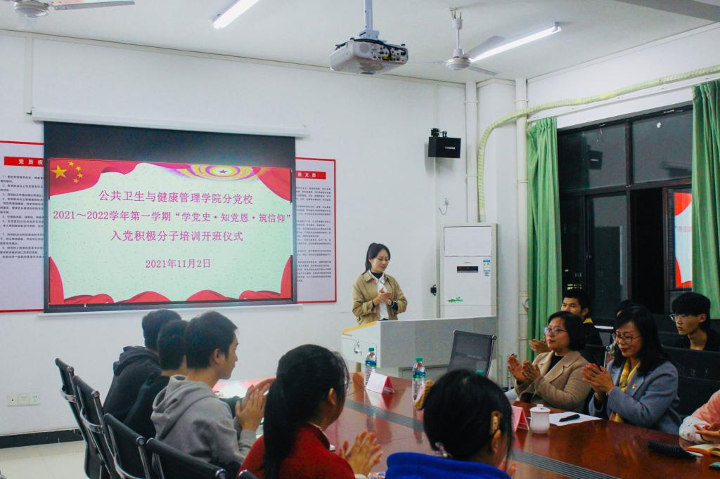 11月2日晚,公共卫生与健康管理学院在黄金校区举办2021-2022学年第一学期“学党史·知党恩·筑信仰”入党积极分子培训开班仪式暨第一讲。该院党委书记范启兰、学生党支部负责人,以及全体入党积极分子30余人参加。