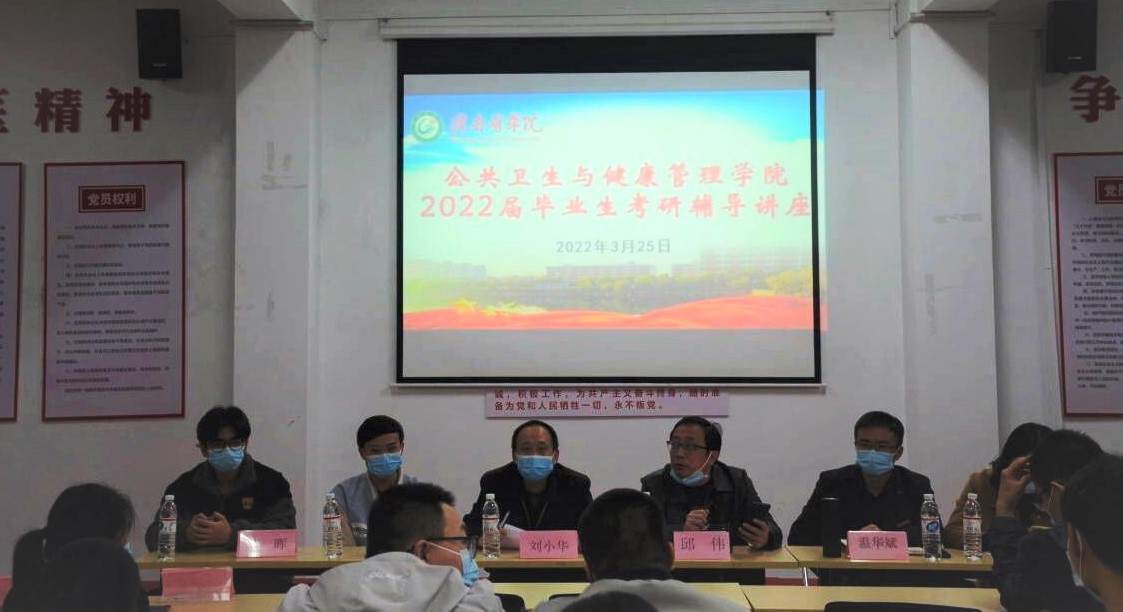 3月26日,公共卫生与健康管理学院在黄金校区举办了2022届毕业生考研辅导讲座。该院党委副书记邱伟出席,教学科研管理办公室主任刘小华、毕业班班主任、毕业生辅导员、优秀研究生代表及2022届准备考研复试的毕业生40余人参加。