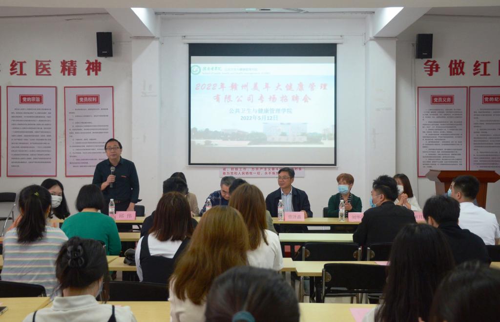 5月12日,公共卫生与健康管理学院邀请赣州美年大健康管理有限公司在黄金校区举办了2022年专场招聘会,学校党委副书记曾泽鑫,该院党委书记范启兰、院长黄诚以及老师代表、2022届毕业生参加。