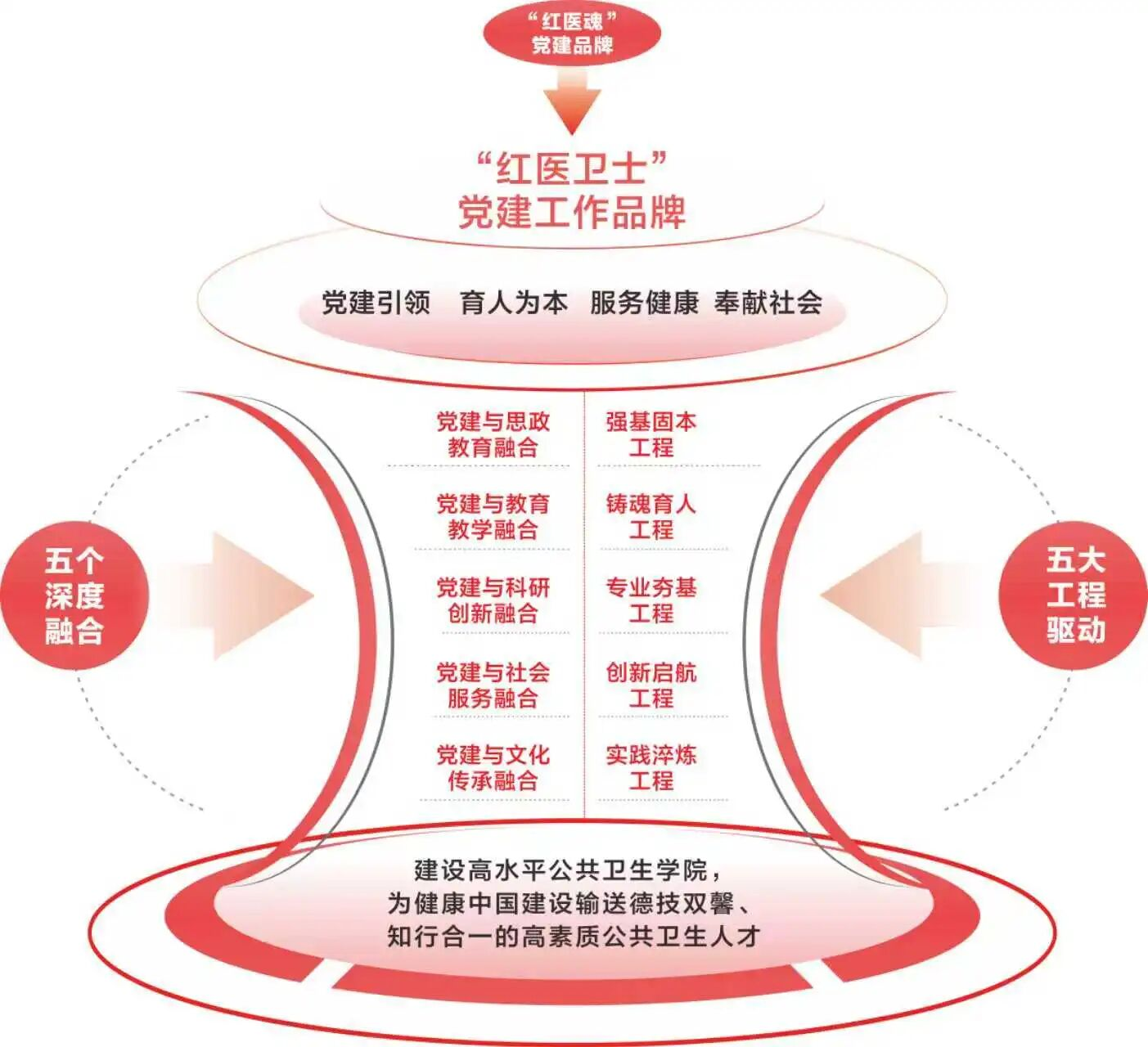 以贯彻落实习近平总书记关于“建设一批高水平公共卫生学院”重要指示精神为目标,聚焦立德树人根本任务,以学校“红医魂”党建品牌为牵引,打造“红医卫士”党建工作品牌,通过政治“固本”、理论“正心”、组织“强身”、制度“护体”、品牌“塑形”五位一体工作法,探索“五个深度融合”“五个工程驱动”,构建“1155”(1个目标、1个品牌、5个融合、5个驱动)党建工作体系,为着力培养德技双馨、知行合一的高素质公共卫生人才,推进健康中国建设提供坚强的政治和组织保障。