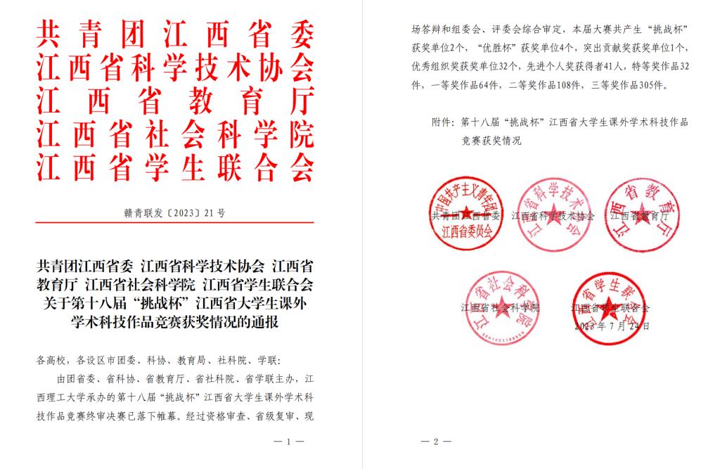 近日,由共青团江西省委、江西省科学技术协会、江西省教育厅、江西省社会科学院、江西省学生联合会共同主办的第十八届“挑战杯”江西省大学生课外学术科技作品竞赛的获奖名单公布。药学院推荐的《创“芯”守护——做食品安全与人类健康的守卫者》和《“酶”好未来——一种高效清除抗生素污染的纳米酶》两项作品喜获三等奖。