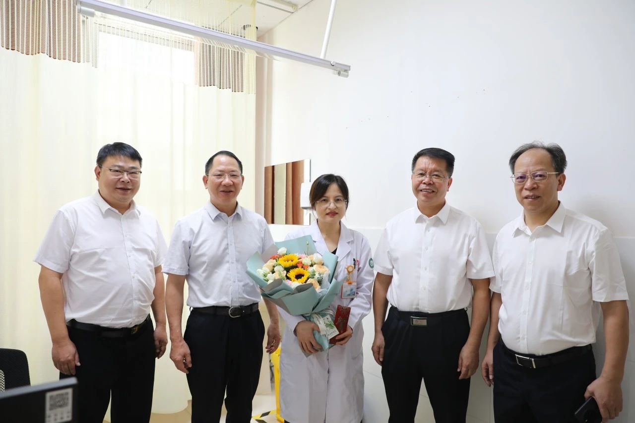 “今天是医师节,是你们的节日,我们代表学校向你们致以最崇高的敬意和最深切的感谢。你们用精湛的医术守护着赣南及周边地区人民群众的生命健康,你们是学校、医院的骄傲,也是社会的宝贵财富。”每到一处,廖伟、黄瑞忠都与医师们亲切握手、交谈,送上鲜花和祝福,传递学校党委对医师们的关爱,询问他们的工作和身体状况,感谢他们常年坚守在临床一线,为守护人民健康、推动学校和医院高质量发展所做出的贡献,鼓励他们继续发扬红医精神,修医德、行仁术,用精湛的医术和优质的服务不断增进人民健康福祉。
