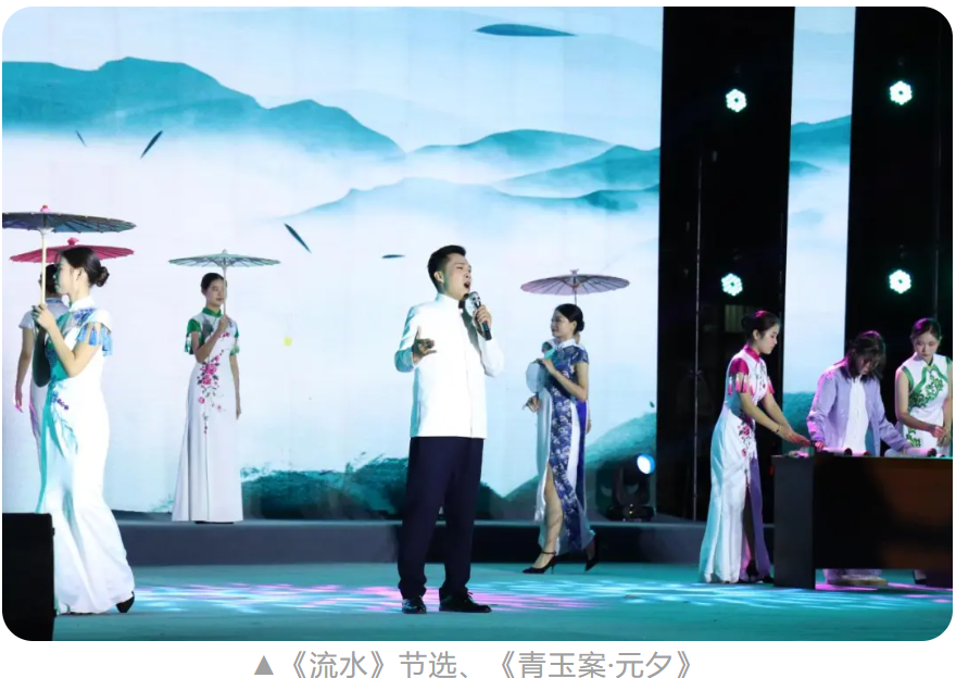指拨弦动,穿越千载风云,以笔走龙蛇的惊鸿之态,感受朗朗歌声的乾坤正气。康复学院与学校社团带来的串烧表演《流水》节选、《青玉案·元夕》演绎出悠悠历史的沉淀与厚重,展现出中国文化的博大精深和刚柔并济。