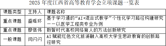 近日,江西省高等教育学会正式公布《关于2025年度学会课题立项的通知》,我校3项课题立项,其中重点课题2项,一般课题1项。今年首次实现重点课题立项的重大突破,充分体现了学校教育教学研究质量的整体提升。
