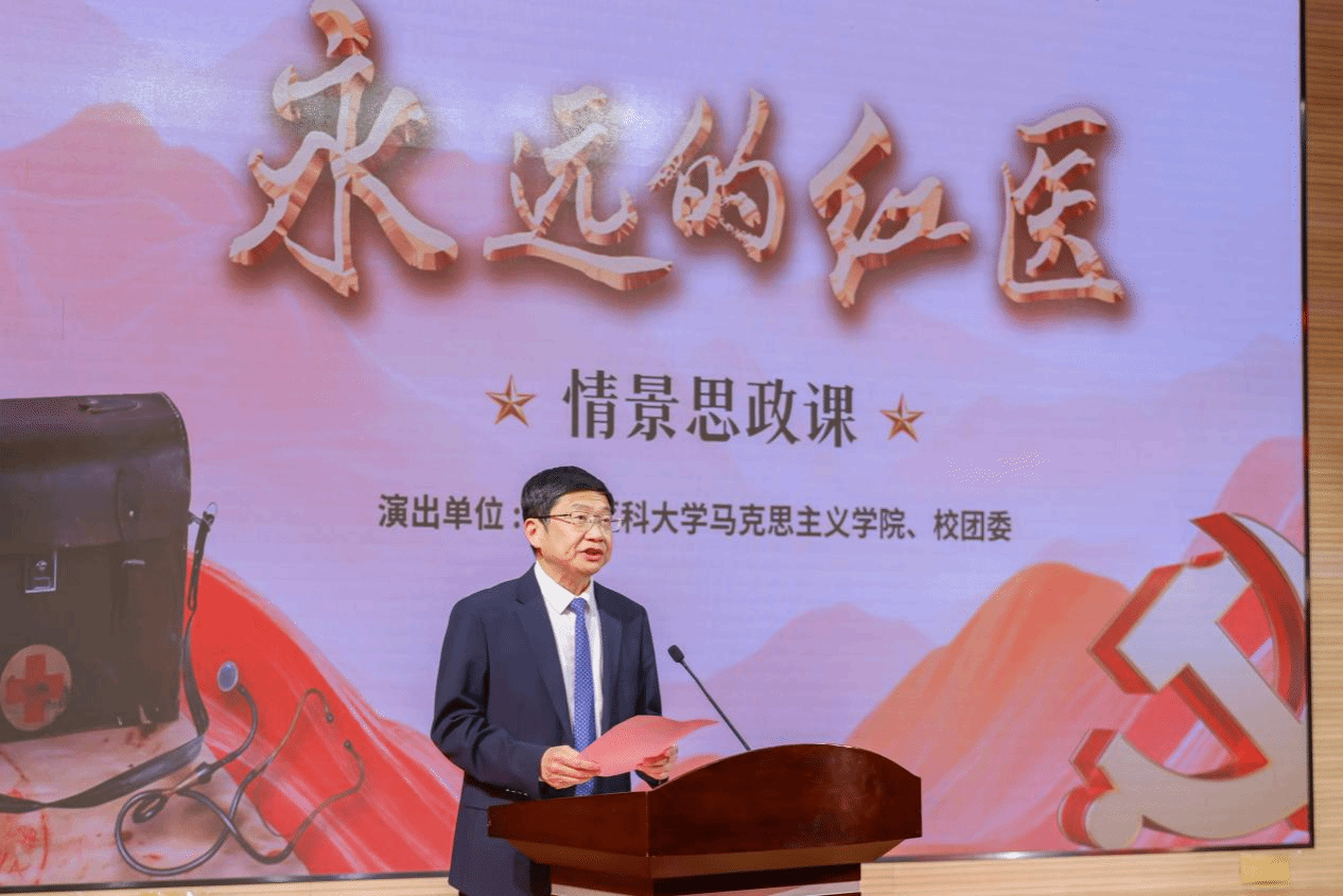 我校党委书记、校长张小康在致辞中对天津医科大学表示诚挚的感谢。他指出,天津医科大学秉承“德高医粹、求真至善”的精神,为我国医学事业培育了大批卓越人才,成就斐然。此次展演是红医精神与严谨治学理念的深度对话,更是共同探索新时代立德树人新路径的生动实践。他在致辞中强调了“红医精神”的核心内涵及其时代价值。他表示,作为扎根于红医精神发源地的高等医学学府,我校有责任将“政治坚定、技术优良、无私奉献、救死扶伤、艰苦奋斗、勇于开创”的红医精神传承好、发扬好。“永远的红医”情景思政课,正是我校依托中央苏区红色卫生史多年的研究成果,探索“师生同台、专题+艺术”沉浸式育人的创新实践。本次展演意在将这份来自红土地的信念与担当,传递至北方医学教育重镇,激发新时代医学青年的共鸣与思考,探寻红医精神密码,在心灵触动中坚定信仰追求。