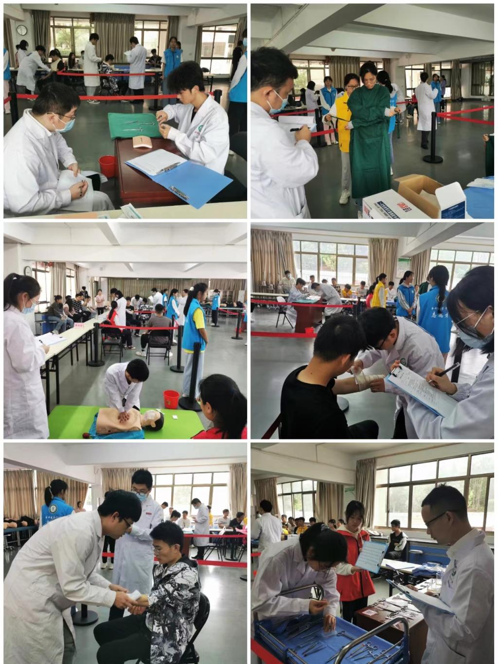 本次竞赛采取双赛道、多站模式。考核项目包括右前臂出血包扎、左前臂中段骨折固定、心肺复苏术、无菌术(穿脱无菌手术衣、无菌手套)、外科常用器械识别+打结、外科缝合等内容。