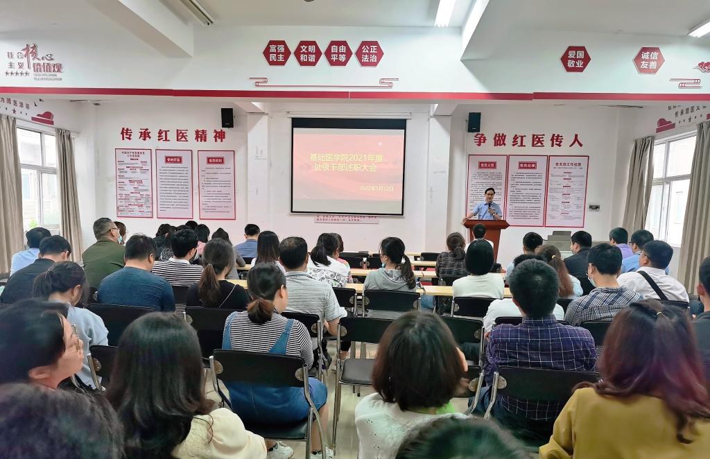 会上,颜剑代表基础医学院领导班子总结报告了2021年工作情况,把一年来该院落实党建工作、人才培养、教育教学、学科发展、深入推进“五大工程”建设及“三个文明”建设等情况向学院师生作了汇报。随后学院党政领导班子成员逐一进行述德述职述廉报告。