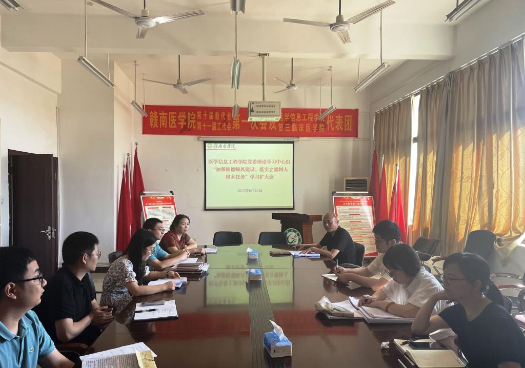 6月23日,医学信息工程学院召开以“加强师德师风建设,落实立德树人根本任务”为主题的党委理论学习中心组扩大会议,该院党政领导、党支部书记、科室主任参加学习。