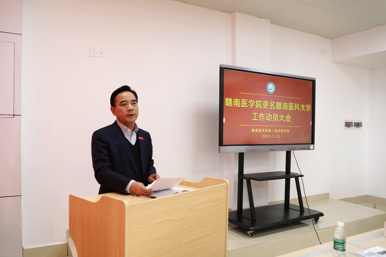 受学校党委副书记、校长兼第一临床医学院党委书记张小康的委托,邹晓峰在会上讲话。邹晓峰表示,全院干部职工一要统一思想、提升认识,切实提升紧迫感和使命感。在更名大学工作面前,没有局外人,人人都是主人翁,全院上下要提高政治站位,把更名大学工作当作目前最紧要的工作任务,配合好学校更名办及相关部门做好迎检准备工作,为决战决胜更名大学而努力奋斗,贡献力量;二要认清形势、抢抓机遇,切实增强更大信心和决心。今天,站在赣医发展的关键节点上,每个赣医人必须增强战必胜、攻必克的信心和决心,抢抓千载难逢的战略机遇,保持敢闯敢干、一往无前的姿态,用汗水浇灌出赣医更加辉煌灿烂的明天。三要明确任务、落实责任,高质量完成相关建设任务。作为全校目前学生体量最大的二级学院,要主动认领工作任务,强化工作分工,加强沟通协作,保质保量完成学校交办的各项工作。要充分利用国检前这段时间进行集中攻坚,倒排工期、加大力度,在国检之前,根据学校部署把各项指标任务、支撑材料及现场考察点准备工作全部完成到位,特别是狠抓“三个文明”建设督查工作,全面做好迎接教育部专家进校考察的各项准备工作。四要凝心聚力、务实奉献,在更名大学工作中担当作为。全院师生员工必须立刻行动起来,进一步树立主人翁意识,强化全院一盘棋思维,维护大局、服从安排,为学校全面建设高水平应用型医科大学贡献智慧和力量。