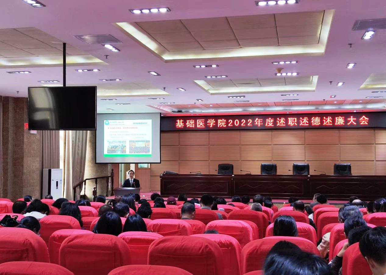 会上,颜剑代表基础医学院领导班子总结报告了2022年工作情况,把一年来落实党建工作、人才培养、教育教学、学科发展、深入推进“五大工程”建设等情况向学院师生作了汇报。随后学院党政领导班子成员逐一进行述德述职述廉报告。