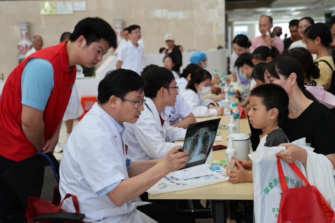 在瑞金市人民医院门诊大厅,社会实践服务团参与开展义诊活动。我校第一附属医院的专家团队及复旦大学上海医学院的博士团队,运用丰富的专业技术为前来求诊的群众提供了细致入微的医疗咨询。与此同时,我校第一临床医学院的学生志愿者团队也积极投入,他们帮助导医分诊、维持现场秩序,为前来咨询的群众及病友提供基础医疗服务,充分展现了新时代医学青年志愿者的服务精神和奉献精神。