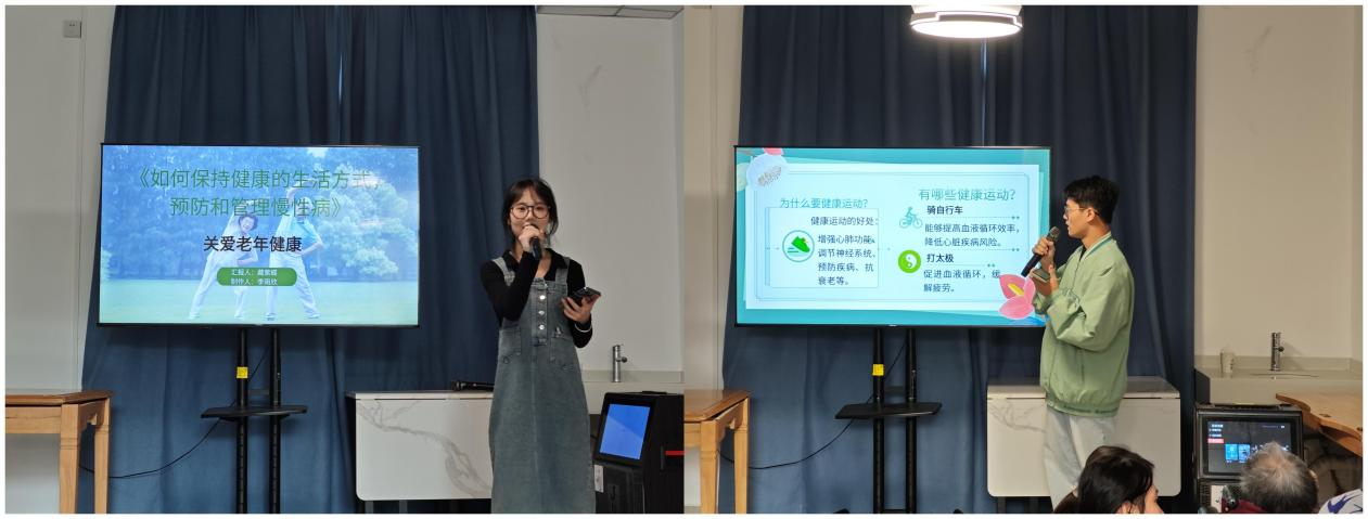 学院师生分别给养老中心老年人作了主题为《老年健康知识》、《如何保持健康的生活方式——预防和管理慢性病》等健康科普讲座,老人们认真聆听并积极参与互动。师生在现场对相关健康管理方法进行了演示指导,带领老年人开展手指操、颈肩及腿部放松操等的训练。