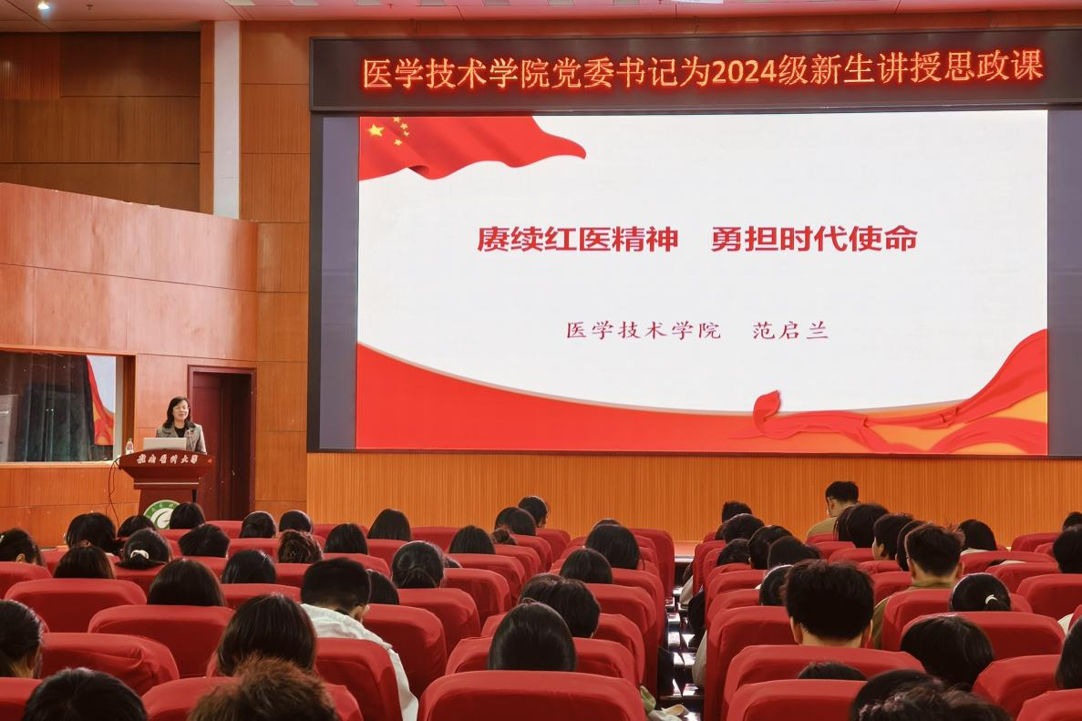 11月28日晚,医学技术学院党委书记范启兰以《赓续红医精神 勇担时代使命》为题,为该院2024级新生讲授思政课,该院辅导员及全体新生到场聆听。