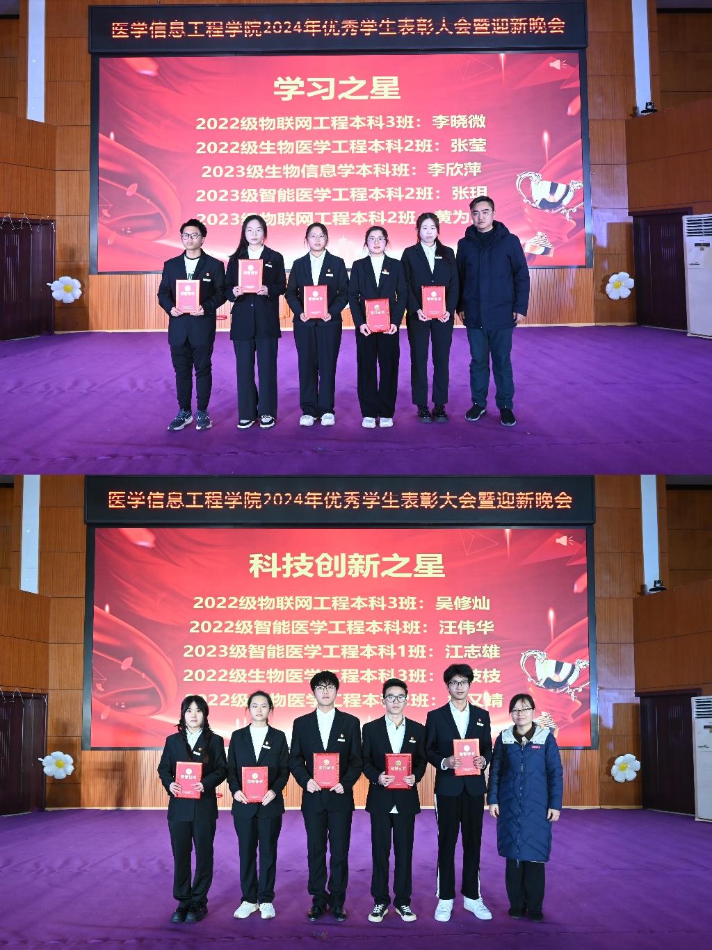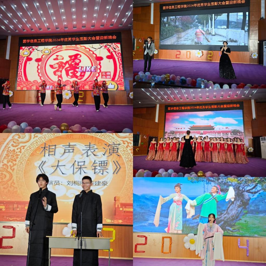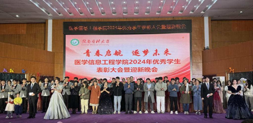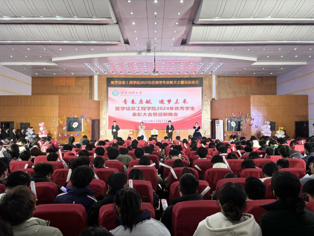 12月12日晚,医学信息工程学院在黄金校区举办“青春启航 逐梦未来”2024年优秀学生表彰大会暨迎新晚会,学校学生工作部(处)副部(处)长曾泽栋、学院党政领导、学工办辅导员、各教研室教师代表、新生班主任和2024级全体新生等400余人参加。