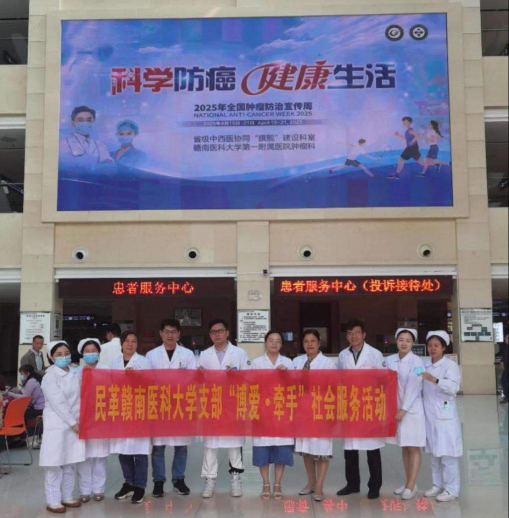 4月18日,在第31个全国肿瘤防治宣传周来临之际,民革赣南医科大学支部联合赣南医科大学第一附属医院中医科、肿瘤内科在黄金院区门诊大厅举办“科学防癌,健康生活”主题公益活动。此次活动旨在贯彻落实“健康中国2030”战略,提高群众防癌抗癌意识,推动肿瘤防治知识普及。