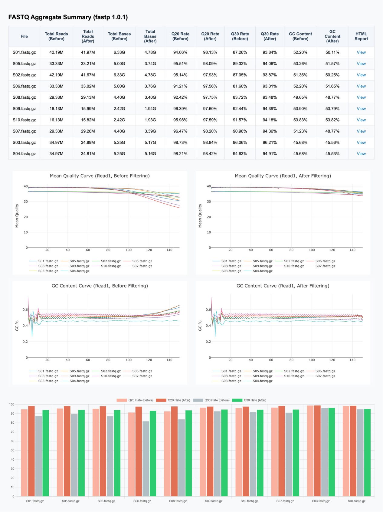 由 fastp 并行批处理脚本生成的 10 个单端 FASTQ 文件汇总报告。所有样本的数据质量均获得大幅提升。