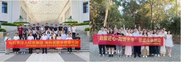 各党支部将红色基因培育融入群团活动。动物大健康党支部组织师生参观赣州市博物馆抗日救亡档案文物展,在珍贵史料中感悟奋斗历程,强化“把论文写在祖国大地上”的使命担当;集体观看爱国题材影片《731》,在沉痛的历史记忆中铭记民族苦难,激发自强不息、科技报国之志。大数据中心党支部则巧妙地将“工匠精神”探讨融入非遗陶艺活动,引导师生在创作中体味精益求精、持之以恒的科研品格,深化对“药匠芯”内涵的理解。