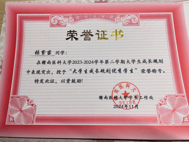 作为一名医学生,张紫苗深知“技术优良”是践行红医精神的核心前提。自入学以来,她始终保持勤勉务实的学习态度,将专业知识学习作为首要任务,凭借扎实的学业表现斩获校级三等奖学金,用成绩印证着“为医者先修业”的信念。在学科竞赛的赛道上,她更是主动挑战自我,与团队并肩作战,在“知行杯”第二届基础化学课程群技能竞赛团体思政赛中荣获二等奖,将专业知识与思政教育深度融合,展现出新时代医学生“又红又专”的综合素质。同时,她早早明确职业方向,以严谨的规划为成长赋能,获评“大学生成长规划优秀学生”,为未来投身医疗卫生事业筑牢根基。