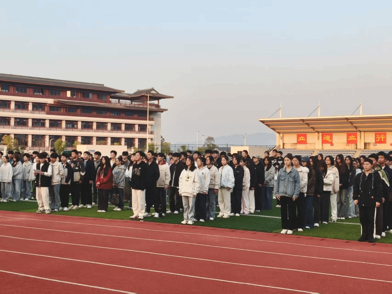 迎着初升的朝阳,五星红旗在雄壮的国歌声中冉冉升起。全体学子肃立行注目礼,齐声高唱国歌,爱国荣校的赤诚之情在每个人心中激荡。