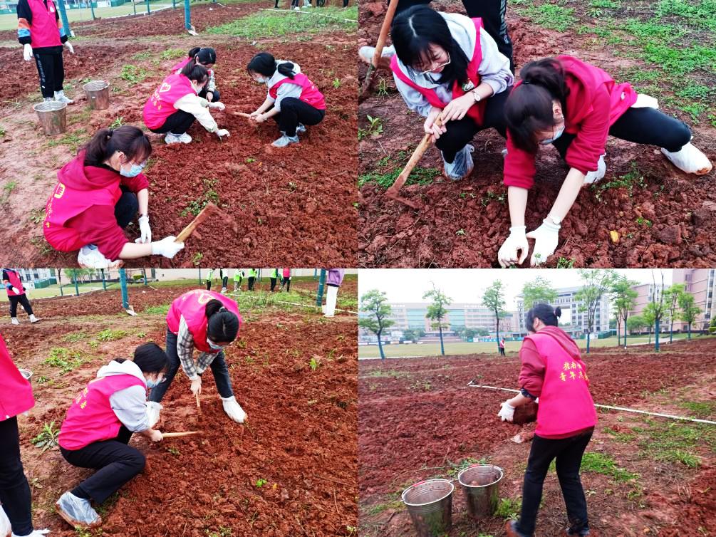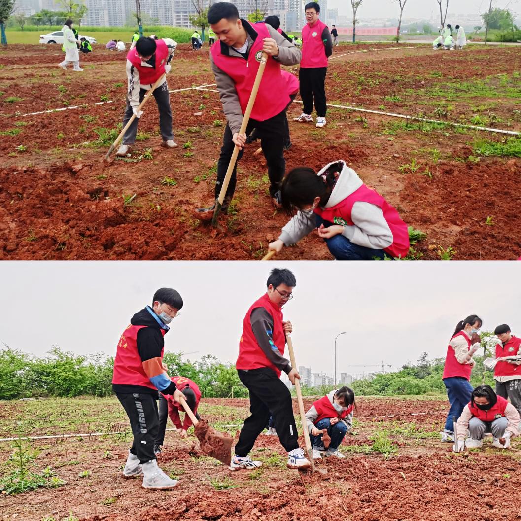 3月27日下午,药学院学生在学校第五实验楼旁开展劳动教育实践基地翻地劳作活动。