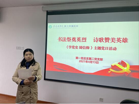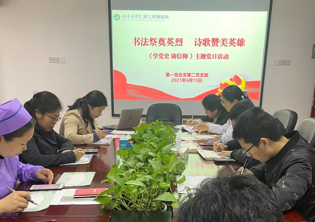 缅怀革命先烈,传承红色基因。第三附属医院第一党总支第二党支部开展以“书法祭奠英烈,诗歌赞美英雄”为主要形式的“学党史,铸信仰”主题党日活动。