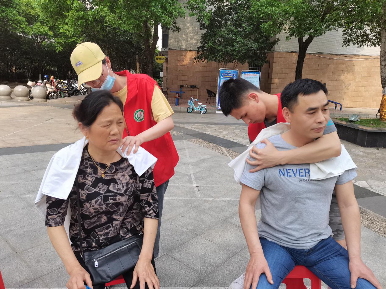 在长征路社区,志愿者配合社区工作人员,向来往的居民发放健康常识和防诈骗知识的宣传手册,并为周围居民提供测血压、康复推拿等常规检查和贴心服务,积极引导人们形成健康的生活方式、树立正确的健康理念。