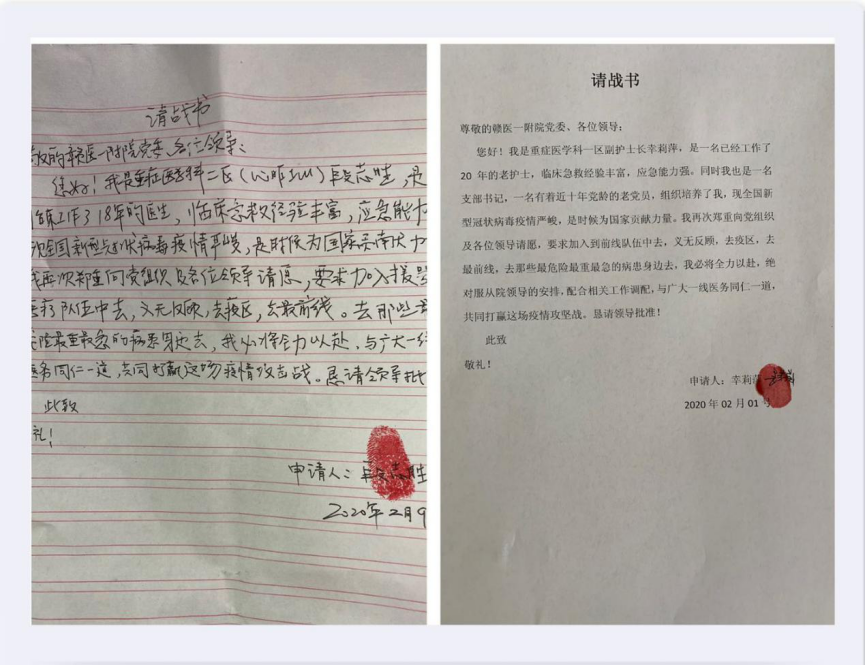 随着疫情发展,当看到全国各地的医疗精英汇聚湖北,逆行武汉时,我被他们那种不畏艰险,舍生忘死的崇高精神深深感染着,我立马拿起笔,也坚定地写下了请战书,请求去最需要重症医生的前线。当得知医院正组建江西省第九批援鄂医疗队支援武汉时,我与同在医院重症医学科一区任护士长的爱人说“我想去,你支持我吗?”