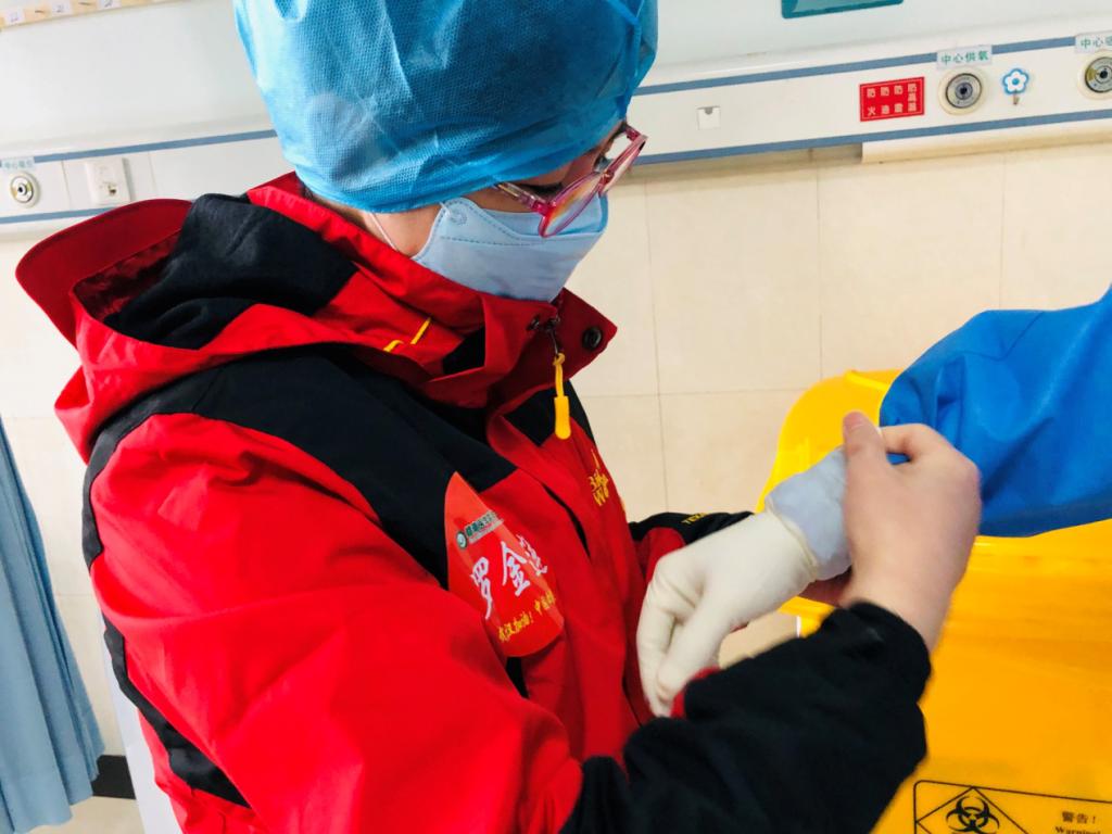 罗金莲在中南医院4号楼19楼为医务人员戴手套