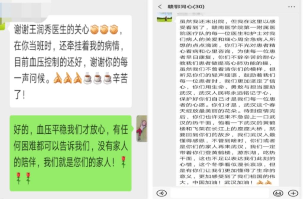 王润秀是个负责任的医生,此前在医院上班的时候,就备受患者欢迎,患者也非常信任她,在武汉大学中南医院抗疫的日子,也是一样,她主动请缨第一天去隔离病房查房,穿着厚厚的防护服,带着口罩和护目镜,作为上级医师,每个病人都详细了解情况,制定治疗方案,进行心理疏导,完善医疗文书及交接班记录,一切都和往常一样,但是她总是不放心,总觉得医患之间距离远,所以她提出申请,要求建立一个微信群,但是刚开始各自原因没建立起来,之后的每次查房看病人,总觉得不放心一些患者,便以个人名义向党组织写了一个申请书,最终建立起来,所有患者非常激动和感恩,纷纷加入群,借助这个群来帮助患者解除心理焦虑,帮助他们解决生活上的困难,并为患者答疑解惑,传播正能量,所有病友都在里面畅所欲言,解决了患者诸多问题,当然医护人员也收获了很多,瞧,有各种感谢的话语,还收到患者的感谢信呢。